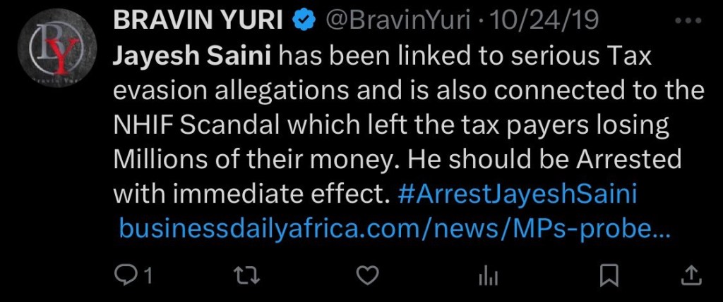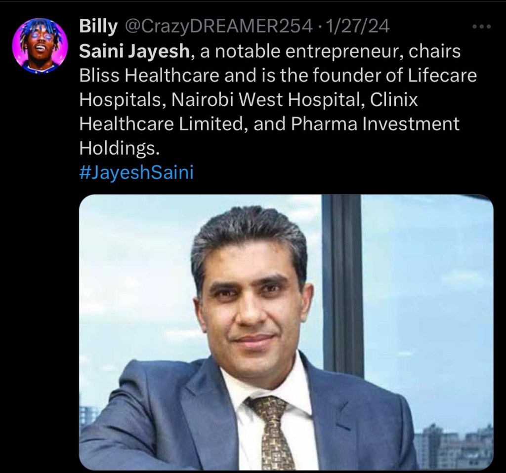He is the owner of bliss hospital, nairobi west hospital where President Ruto, Gachagua gets treated. He was the mastermind of clinix scandal that saw government loose billions of shillings.