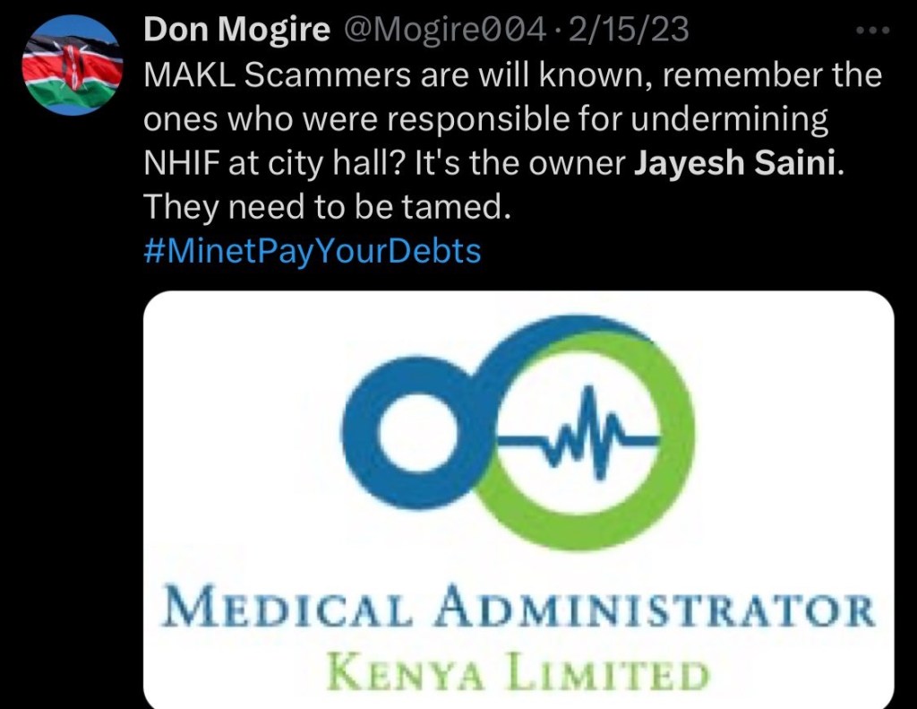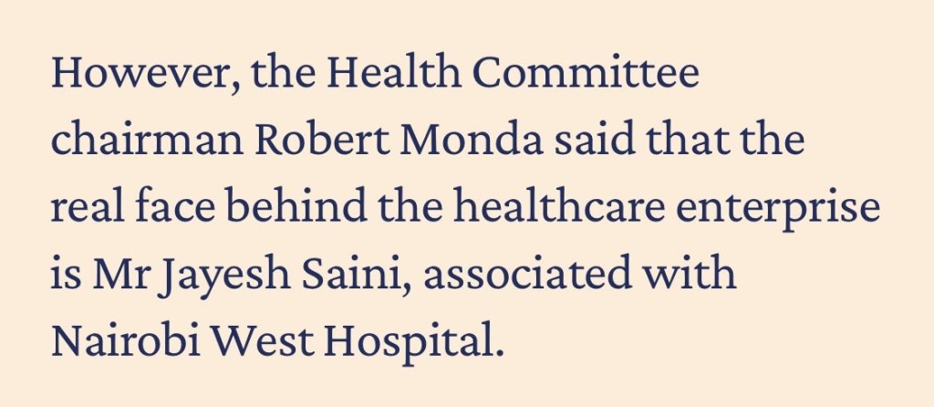 This shows the deep political ties this guy has On top of his well orchestrated game, he is the bulldoser clearly, he as well owns Medical Administration Kenya Ltd (MAKL) thru’ proxies —responsible for sorting out insurance claims for private hospitals.