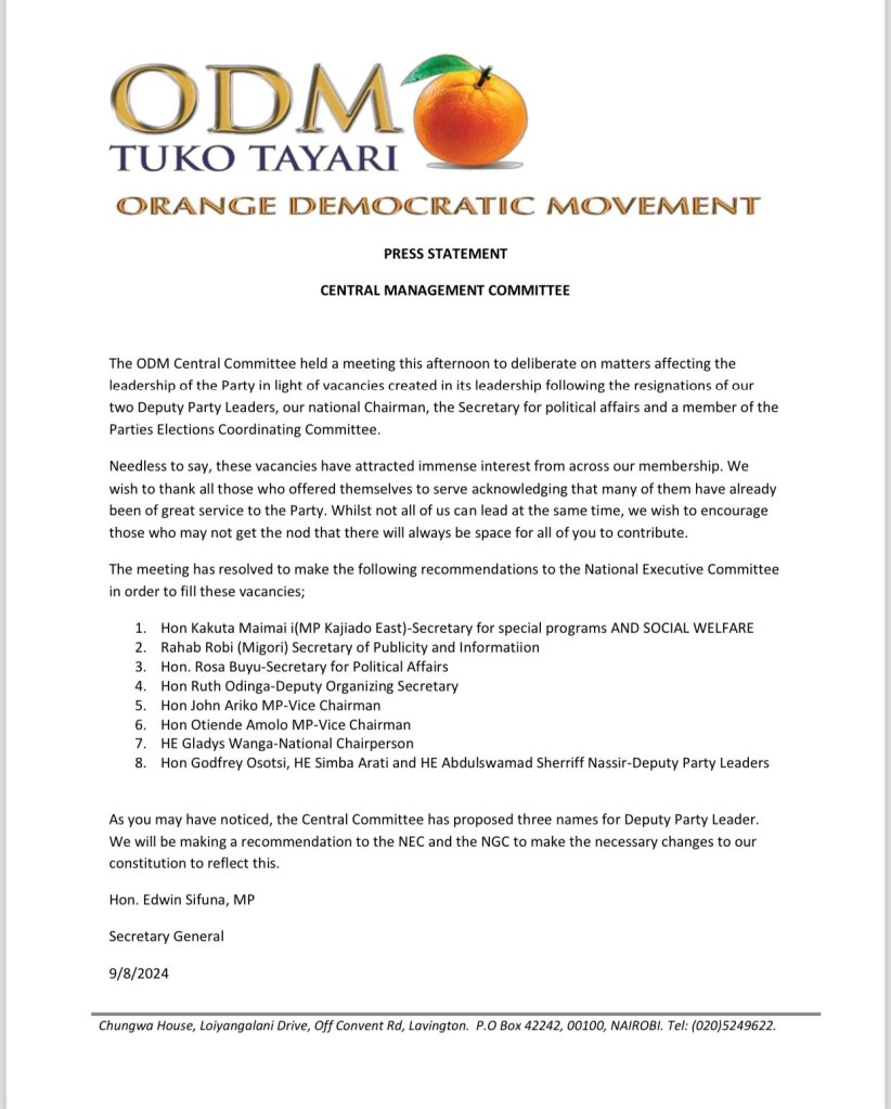 “The ODM Central Committee held a meeting this afternoon to deliberate on matters affecting the leadership of the Party in light of vacancies created in its leadership following the resignations of our two Deputy Party Leaders, our national Chairman, the Secretary for political affairs and a member of the Parties Elections Coordinating Committee.”