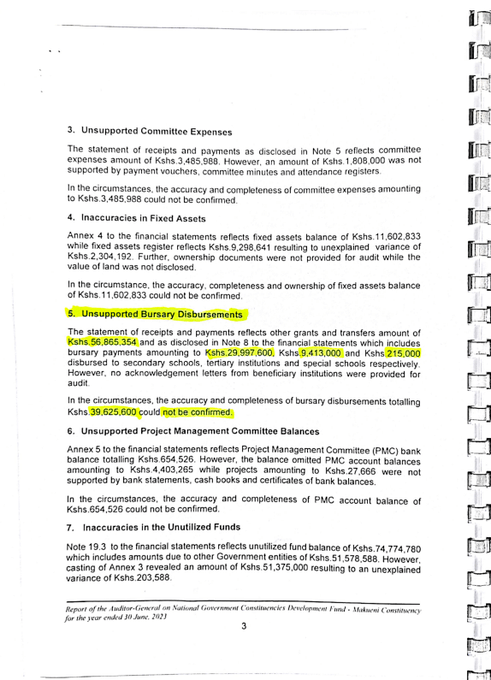 The report also exposes a massive shortfall in the documentation for bursaries disbursed by Kiamba.