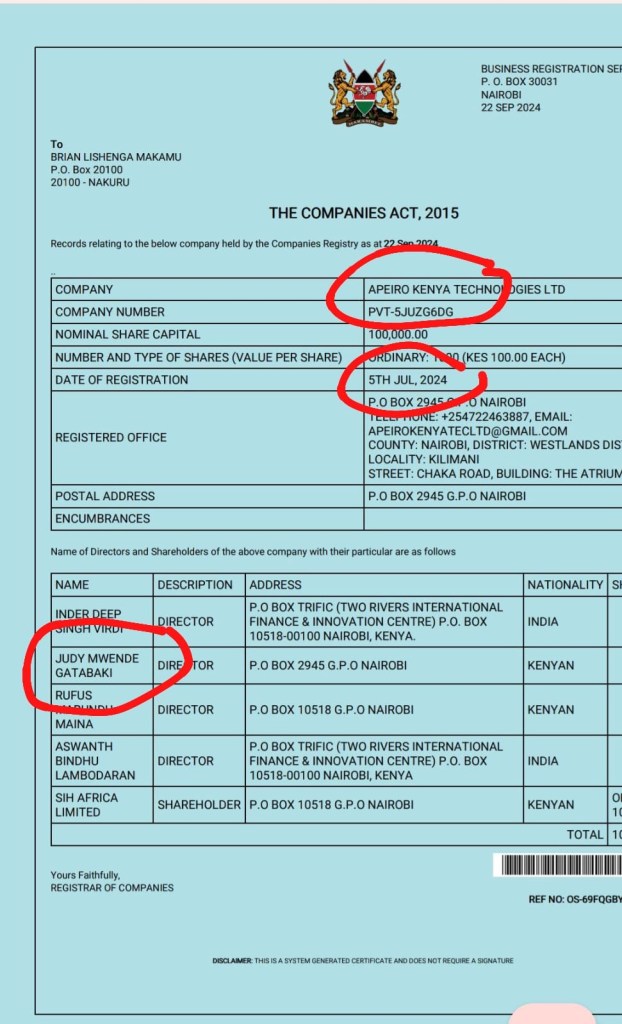 Apeiro is a subsidiary of Sirius International Holdings, which in turn is a part of Abu Dhabi’s International Holding Company (IHC), a firm with ties to India’s Adani Group. The company’s directors include Mwende Gatabaki, the wife of President Ruto’s economic adviser, David Ndii.