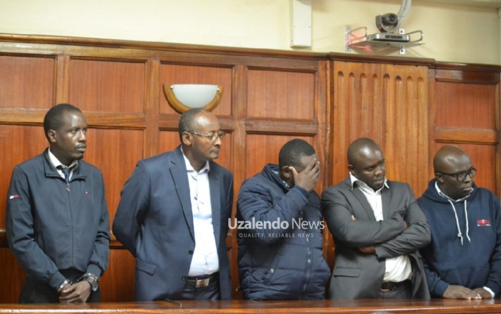 Faulu Microfinance bank credit officers Amos Mugweru mwangi, Peter Kefa Onsongo and Tom Jaseme together with Trader Paul Njuki, businesswoman Esther Muthoni Maina and auctioneer Robert Wamwere Maina were charged that on diverse dates at unknown place in Nairobi within Nairobi county jointly conspired to defraud Alice Wanjiru Wamwea by means of fraudulent auction of her property LR NO 209/11315, in Huruma which valued at Sh 150 million.