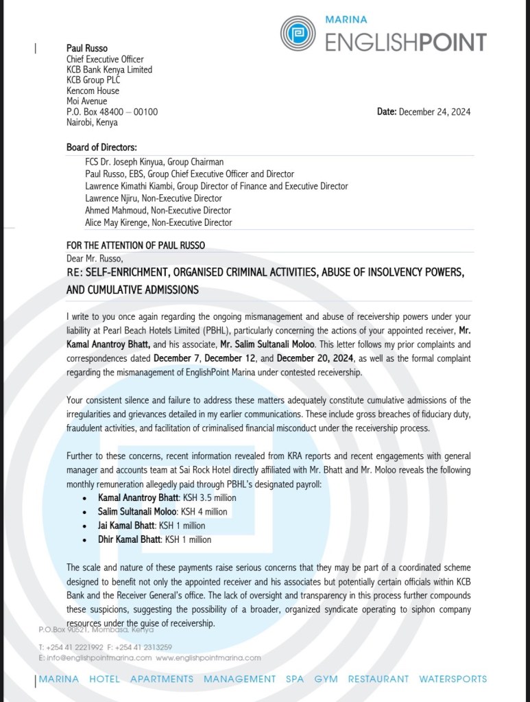 In December 2024, Nazir Bhaduralli NurMohammad Jinnah as the director of legal affairs for the embattled English Point Marina wrote an exclusive letter raising concerns and alleging cases of financial malpractices, financial crimes, tax evasion, money laundering that KCB Bank has been engaging in among many more.
