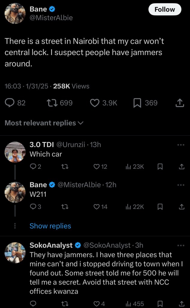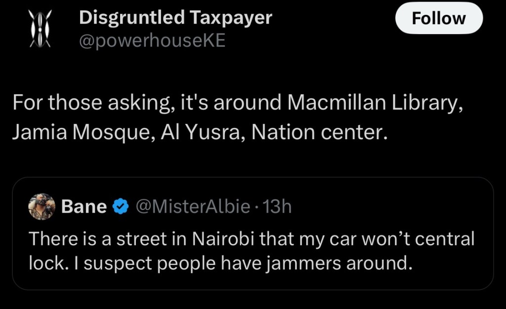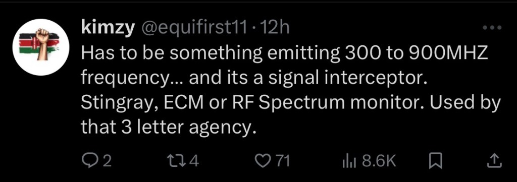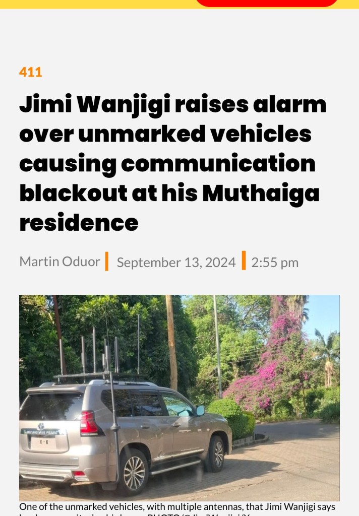Remember when Safina Party Leader Jimi Wanjigi was being trailed and monitored during the Revolutionary GenZ demonstrations and was put under house arrest on allegations of instigating, inciting and funding the protests? The car he posted with antennas were Jammers to interrupt his communication and the surrounding area within 10m or more radius.