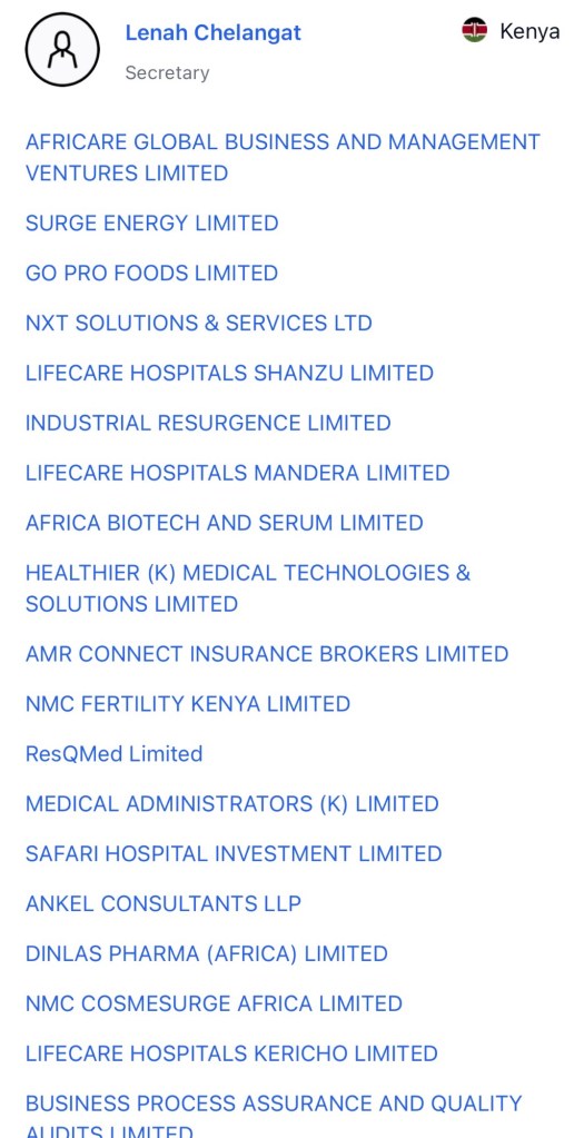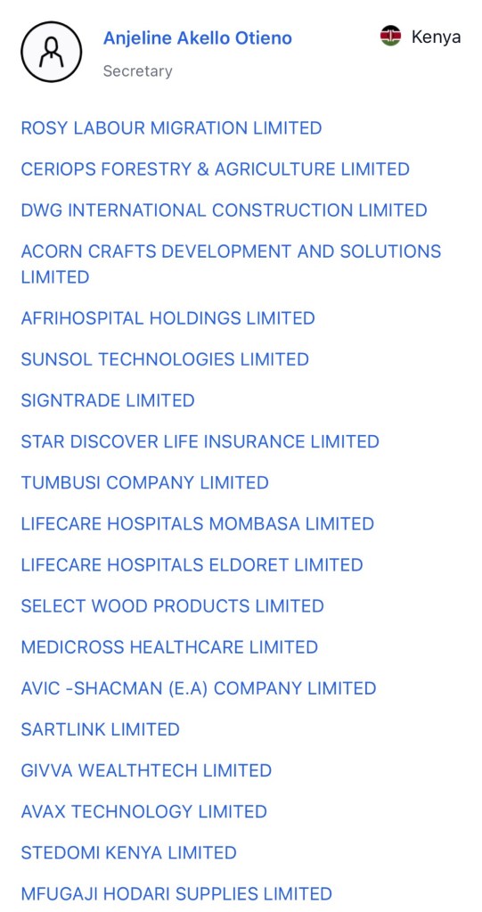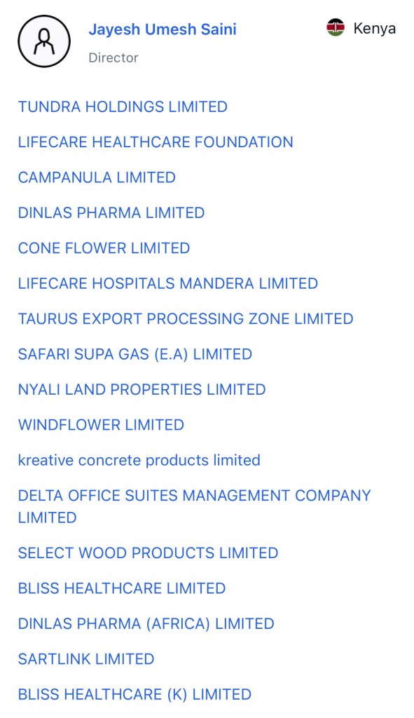 A data leak opened a pandora box that recently exposed Jayesh Saini who has been linked to over 30 companies directly, some through proxies where you find two secretaries Lenah Chelangat and Angeline Akello Otieno of his companies are secretaries to over 20 companies of which some of the companies where Jayesh is not directly registered, the secretaries are registered or Adil Khawaja is registered or his PA Mishant Mishra is registered. Presence of all these indiviuals validated indirect presence of Jayesh Saini and so is President William Ruto in some. Shell companies.