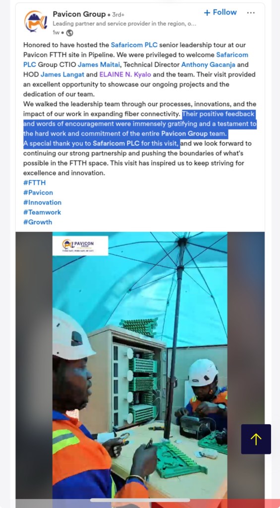 And Still, this has not stopped Josephine Kanyi from publicly presenting herself as the CEO of Pavicon Group for months, even inviting senior Safaricom employees to visit ongoing projects by “Pavicon Group”.